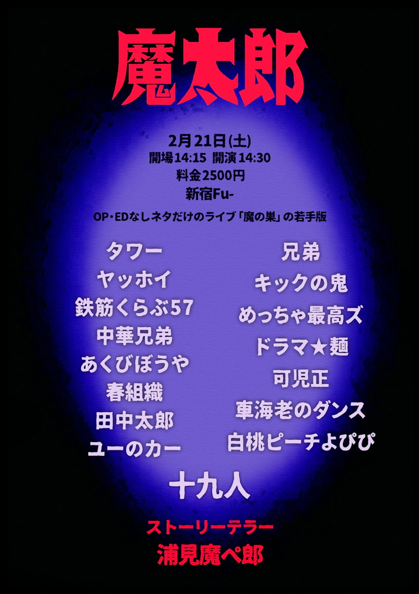 オープニング・エンディング・中MCなし。ネタだけのライブ。「魔の巣」若手版。