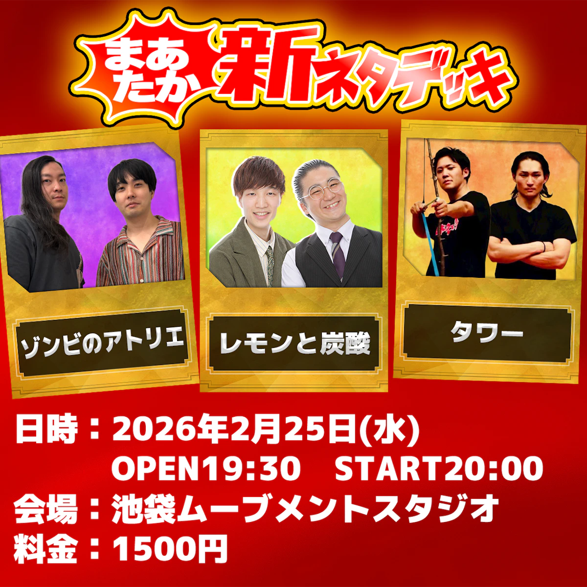 【概要】「レモンと炭酸」と「タワー」がネタを2本ずつ「ゾンビのアトリエ」が新ネタを3本やるライブです。できるか!?最強の新ネタデッキ!【チケット】¥1,500-(税込)購入はコチラ→https://tiget.net/events/455673
